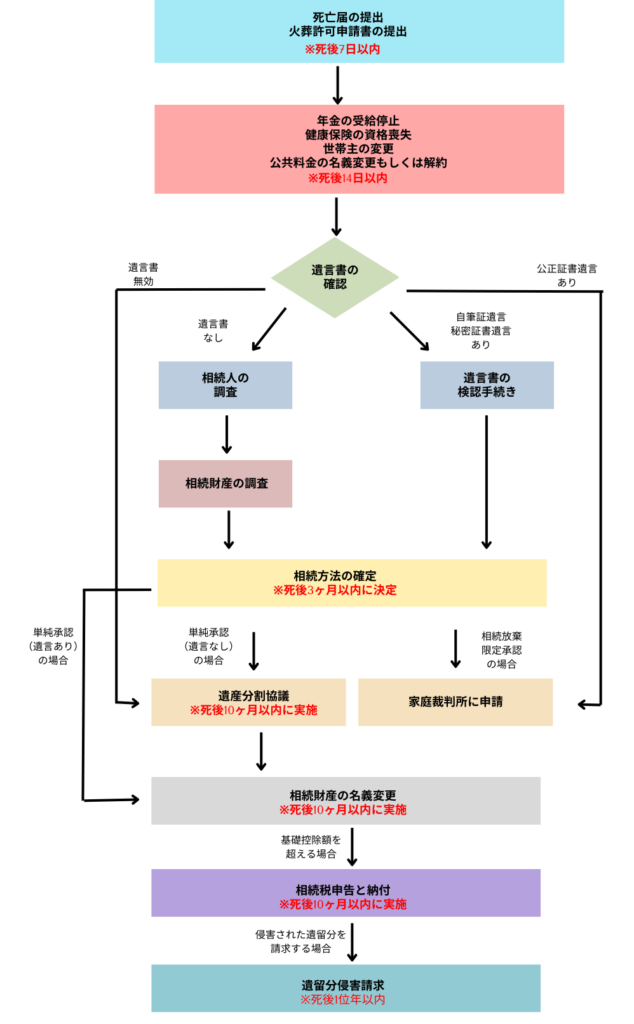 以下では相続手続きの流れと期限についてフローチャート式の図にまとめました。