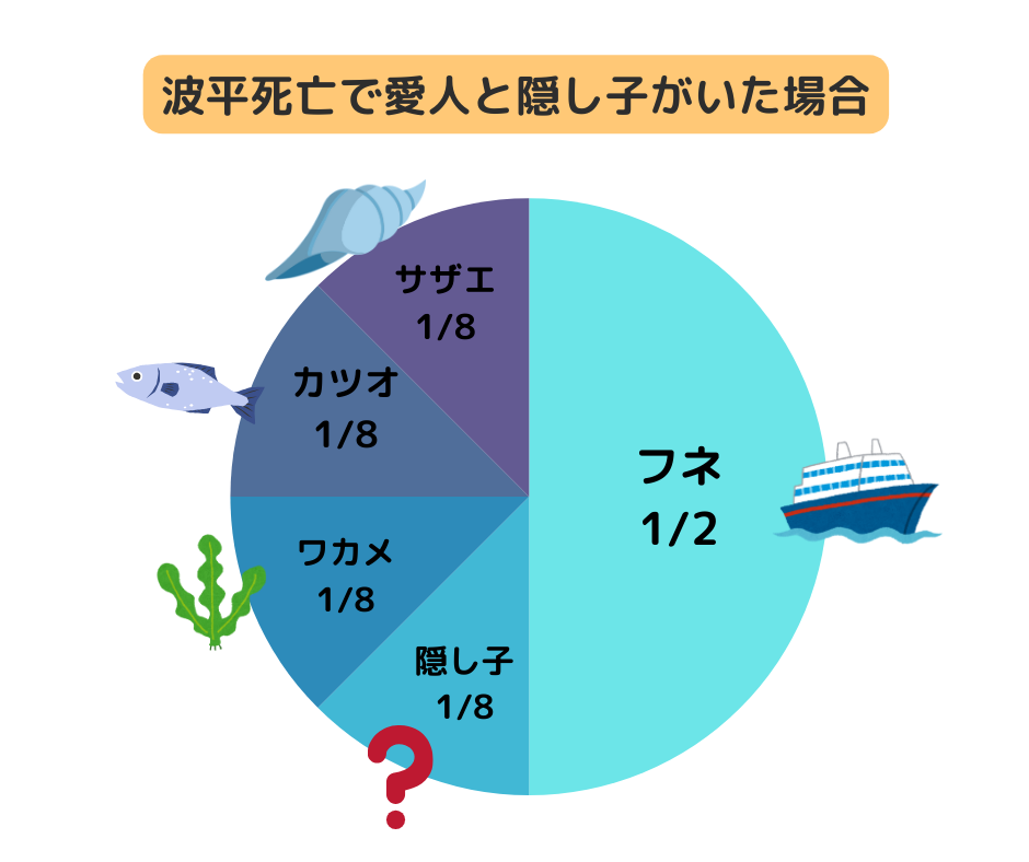 たとえば隠し子がひとりいれば、サザエ・カツオ・ワカメ・隠し子の4人で1/2を分け合うため、それぞれ1/8ずつです。